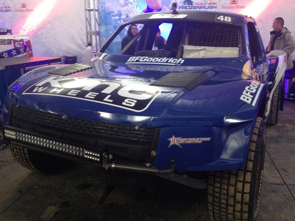 Well, with the ice, BFGoodrich has made the studded tires, and these are way more aggressive—they’re not like bolts and stuff on the rally cars. So with the truck being heavier, how much suspension it wants to set, and with the spiked tires, you’re just off a little bit. I was pushing the first lap and I over rotated. We have a right and a double brake in the car, a right and left pedal, I was on just the rear pedal, and I over rotated. I went to dab the brake just a little to catch it and I hit the rear pedal again—I over rotated more, then I was kind of just a sitting duck, slid into the concrete wall, did some cosmetic damage to the front of the truck, lost over five seconds screwing around and getting back on course.
