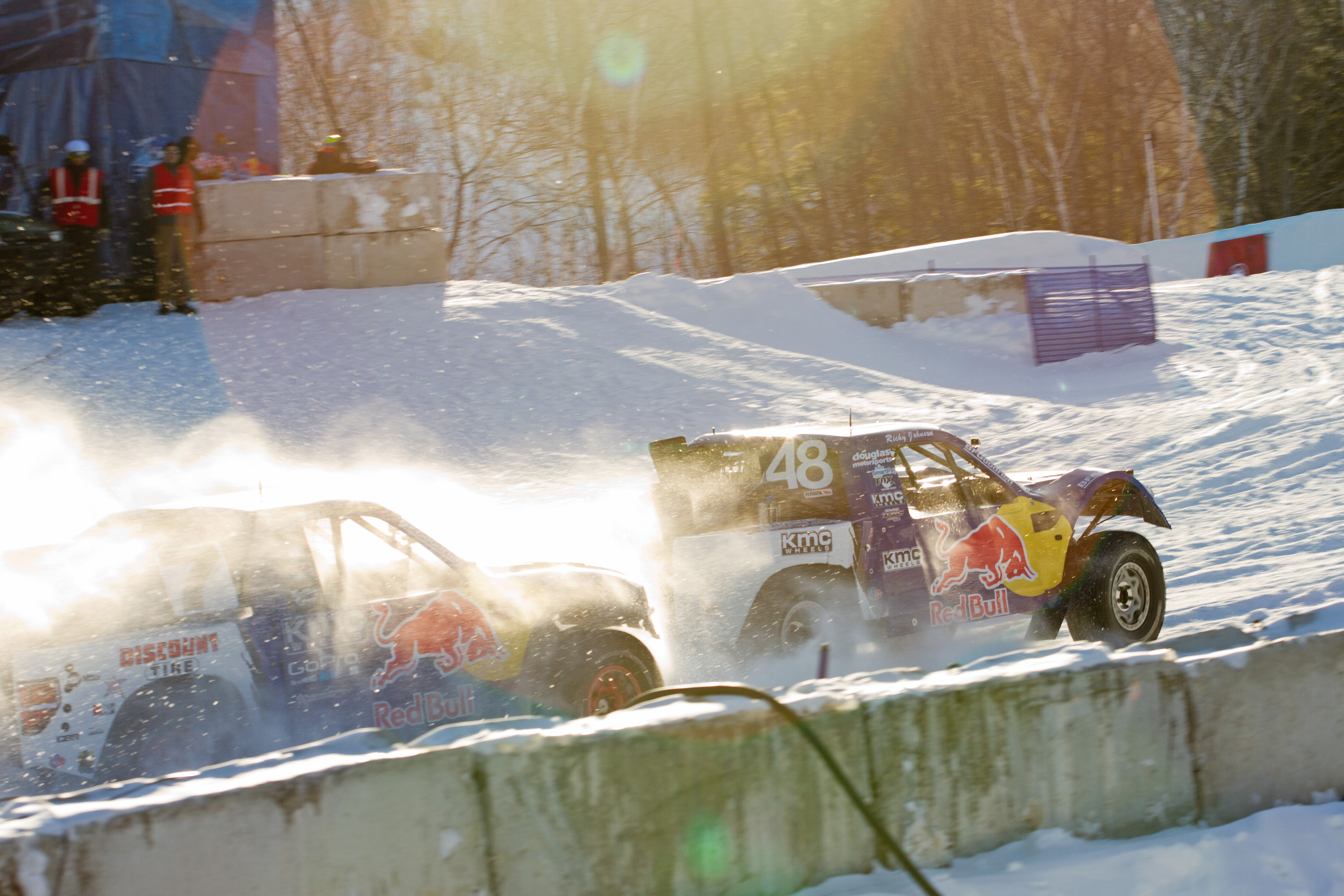 Unlike last year’s event, which featured a time attack format, the second annual Red Bull Frozen Rush featured the trucks competing side-by-side in multiple portions of the 1.5-mile course. Two lanes, a red and blue lane, were constructed, with drivers alternating between lanes each lap. Besides specially-designed studded BF Goodrich tires, large flaps were added to the back of each truck to mitigate roost and make side-by-side racing possible.